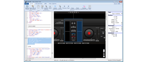 This tool offers several advanced features such as XML error check to automatically check for errors before loading the Skin in VirtualDJ. Clone elements to automatically create XML code for deck 2, 3, ... using deck 1 code. Picture highlighter that analyses all XML code and highlights every position in the picture that has been coded. You will never miss a button again.